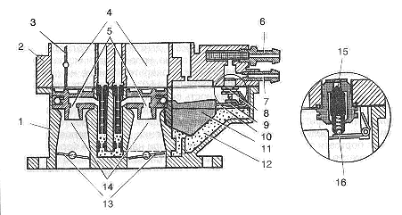 1 - корпус; 2 - кришка; 3 - повітряна заслінка; 4 - вхідні повітряні канали; 5 - розпилювачі головних дозуючих систем; 6 - штуцер підведення палива; 7 - топливовозвратный штуцер; 8 - корпус замочної голки поплавцевого механізму; 9 - язичок кронштейна поплавців; 10 - кронштейн поплавців; 11 - поплавці; 12 - поплавцева камера; 13 - дросельні заслінки; 14 - дифузори; 15 - замочна голка; 16 - демпфуюча кулька замочної голки.
