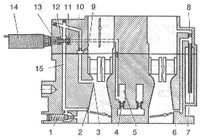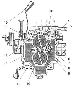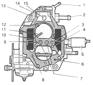 1 - гвинт регулювання складу суміші на неодруженому ходу; 2 - щілинний перехідний отвір; 3 - отвір забору повітря, що емульсує, в систему неодруженого ходу: 4 - головний паливний жиклер первинної камери; 5 - емульсивний колодязь головної дозуючої системи первинної камери; 6 - перехідний отвір вторинної камери; 7 - паливний жиклер перехідної системи вторинної камери; 8 - повітряний жиклер перехідної системи; 9 - проти-дренажний отвір; 10 - повітряний жиклер системи неодруженого ходу; 11 - отвір паливного жиклера неодруженого ходу; 12 - паливний жиклер системи неодруженого ходу; 13 - голка клапана з пластмасовим наконечником; 14 - електромагнітний клапан; 15 - емульсивний канал.