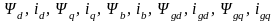 – відповідно потокозчеплення та струми обмоток: статора (по осям d і q), збудження і демпферних (по осям d і q);