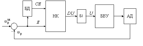 Нейроконтролер, на підставі значення сигналу помилки Е установлення швидкості, відповідно змінює вихідний сигнал DU так, щоб поточна швидкість відповідала швидкості, що задається .