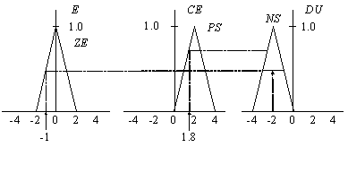 Областю визначення всіх нечітких перемінних є інтервал [-1, 1] відносних значень відповідно сигналів помилки по кутовій швидкості, по похідній кутовій швидкості і по сигналі керування. Як форми функцій приналежності нечітких лінгвістичних перемінних Е, СЕ, DU розглядалися форми, приведені на рис. 3.5.