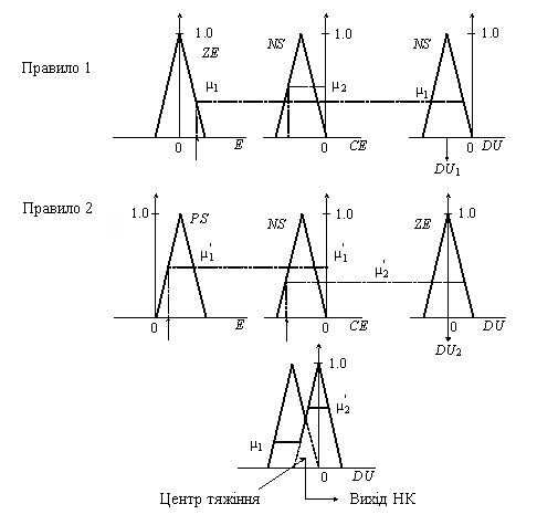 Формування вихідного сигналу нейроконтролером здійснюється на основі декількох окремих нечітких правил. На рис. 3.3 приведена ілюстрація принципу формування сигналу керування DU на основі двох правил з використанням методу Мамдані [21]: