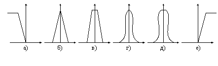Спочатку обиралися однотипні форми функцій приналежності (для входу і виходу). При цьому отримали, що якщо функції приналежності описувалися формами а) - в) і е), то нечіткий нейроконтролер функціонував практично однаково, тільки якщо використовувалися функції вигляду в) (трапеціїдальні), одержали деяке перерегулювання в порівнянні з функціями вигляду б).