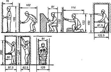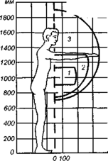 При работе сидя рабочее место обеспечивает выполнение трудовых операций в пределах зоны досягаемости моторного поля как вертикальной, так и горизонтальной плоскостях (рис. 15)
