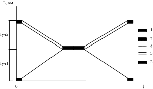 Рис. 9. График работы автомобилей-тягачей по системе тяговых плеч; 1,2 — операции прицепки-отцепки полуприцепа; 3 — отдых (обед) водителя; 4 — движение тягача, работающего на первом участке; 5 — движение тягача, работающего на втором участке.