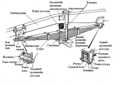 Коренной лист рессоры прямоугольного сечения, а остальные листы Т-образного сечения. Всего 15 листов. На скользящем конце коренного листа заклепками закреплена накладка, предохраняющая его от износа. Пальцы рессор смазываются через масленку.