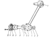 Рисунок 3 - Реактивная штанга: 1 - масленка; 2 - гайка; 3 -шайба пружинная; 4 - сальник; 5 - штанга; 6 - заклепка; 7 - вкладыш внутренний; 8 - палец; 9 - вкладыш наружный; 10 - пружина; 11 - прокладка; 12 – крышка