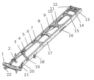 Рисунок 4 - Рама автомобиля КамАЗ. Рама автомобиля: 1 - поперечина № 1; 2 - кронштейн передней опоры силового агрегата; 3 -поперечина № 2; 4 - кронштейн задней опоры двигателя; 5 - лонжерон правый; 6 - кронштейн балки поддерживающей опоры силового агрегата; 7 - поперечина № 3; 8 - поперечина № 4; 9 - косынка нижняя поперечины № 5; 10 - косынка верхняя поперечины № 5; 11 -поперечина № 5; 12 - поперечина задняя; 13 - раскос задней поперечины; 14 - поперечина № 7; 15 - поперечина №6; 16 - прокладка кронштейна балансирной подвески; 17 - лонжерон левый; 18 - задний кронштейн передней подвески; 19 - кронштейн амортизатора; 20 - кронштейн опоры радиатора; 21-кронштейн передний передней подвески; 22 - кронштейн буфера