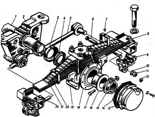 Рисунок 2 - Задняя подвеска автомобилей КамАЗ-53212, -54112 и -5511: 1 - ось; 2 - кронштейн оси балансира; 3 - уплотнитель нос кольцо башмака рессоры; 4 - манжета; 5 - реактивная штанга; 6 - распорная втулка; 7 - заклепка; 8 - ограничитель качания мостов; 9 - нижний реактивный рычаг; 10 - пружинная шайба; 11 - гайка; 12 - пробка; 13 - крышка башмака; 14 - прокладка крышки; 15 - гайка крепления башмака; 16 - втулка башмака; 17 - болт; 18 - башмак рессоры; 19 - стремянка рессоры; 20 - лист № 4; 21 - лист № 1; 22 - передняя опора рессоры