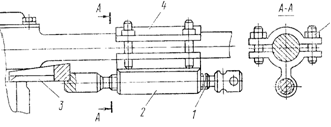 Рисунок 5 - Снятие съемником пальцев реактивных штанг: 1 -винт; 2 - корпус; 3 - клин; 4 - крышка; 5 - гайка; 6 – шпилька