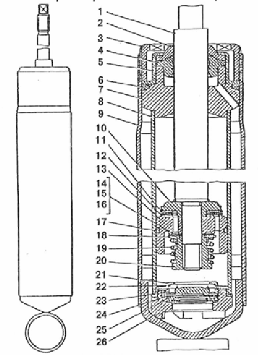 1 – шток; 2 – защитное кольцо; 3 – гайка резервуара; 4 – манжета штока; 5 – обойма манжеты; 6 – уплотнительное кольцо; 7 – направляющая втулка штока; 8 – цилиндр; 9 – резервуар; 10 – ограничительная тарелка; 11 – пружина перепускного клапана; 12 – тарелка перепускного клапана; 13 – поршень; 14 – дроссельный диск; 15 – диск клапана отдачи; 16 – шайба; 17 – кольцо поршня; 18 упорная тарелка; 19 – пружина клапана отдачи; 20 – гайка; 21 – обойма клапана сжатия; 22 – пружина впускного клапана; 23 – тарелка клапана сжатия; 24 – дроссельный диск; 25 – диск клапана сжатия; 26 – корпус клапана сжатия.