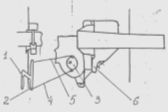 1 – расцепной рычаг; 2- блокирующее плечо; 3 – валик подъемника; 4 – блокирующая цепь; 5 – расцепная цепь; 6 – ограничитель вертикальных перемещений.