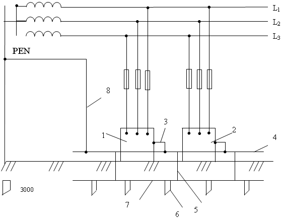 1,2 – электроустановки; 6 – трубчатые заземлители; 3 – зануляющий проводник; 7 – соединительная полоса; 4 – зануляющая магистраль; 8 – нулевой ввод; 5 – выводы контура повторного заземления нулевого провода;