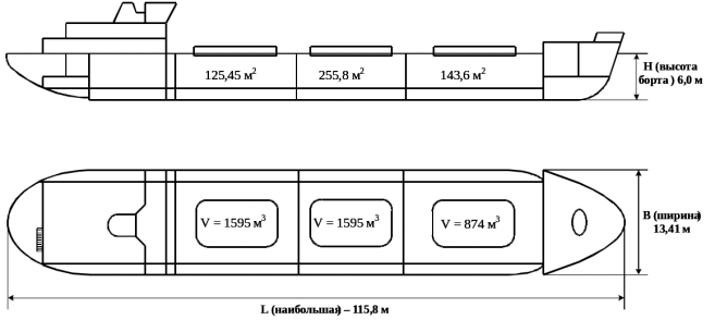 | Трюм №1 Трюм №2 Трюм №3 | 30–52 52–98 98–145 | 874 1595 1595 ∑4064 | 14,2 25,3 25,3 | 10,11 10,11 10,11 | 6,17 6,17 6,17 |