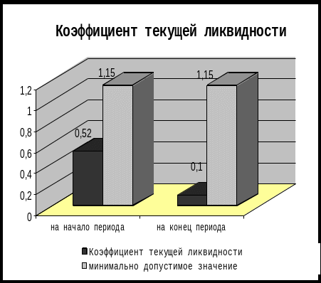 Как видно из диаграммы (рис. 1), на конец отчетного периода коэффициент текущей ликвидности уменьшился на 0,42 пункта, что говорит о недостаточной обеспеченности филиала собственными оборотными средствами для ведения хозяйственной деятельности и своевременного погашения срочных обязательств к нормативу, а также характеризует отрицательную тенденцию увеличения оборотных средств на конец года.