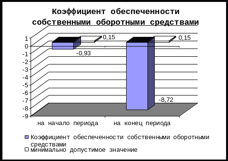 | Коэффициент обеспеченности собственными оборотными средствами (Кс.о.) | Кс.о. = ( раздел III + стр.550 – раздел I)/ раздел II | -0,93 | -8,72 | 7,79 |