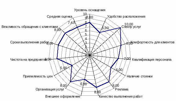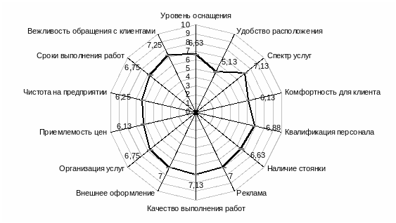 Расположение предприятий характеризуется удобством для посещения предприятий клиентами. В этом отношении можно сказать, что все предприятия расположены в целом в неудобных местах (среднее значение – 5,12), что естественно, поскольку предприятия автосервиса имеют ограниченную социальную значимость. Тем не менее, предприятия Ягуар (8) и Фортуна (7) расположены достаточно удобно, что позволяет им иметь позитивные предпосылки для развития. С другой стороны предприятия Нико (3) и Поларис (3) расположены в неудобных местах, что ограничивает их потенциальные возможности развития на ближайший период.