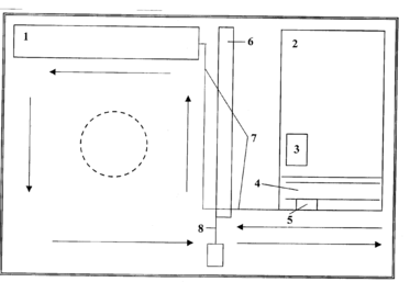 Рис. 3.13. Схема внешней заправочной станции: 1 – маслохранилище; 2 – гараж на 98 мест 2 а/к; 3 – масло-подвал; 4 – линия ТО-1; 5 – пункт раздачи масла; 6 – забор; 7 – линия связи маслохозяйства с пунктом раздачи масла на линии ТО-1; 8 – ворота