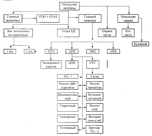 В связи с происходящим перевооружением автобазы и переходом на новые современные автомобили предлагается по мере поступления новой техники отказаться от деления автоколонн по маркам автомобилей и разделить автоколонны на бригады по специфике перевозимого груза. Это упростит обработку информации. На рис. 3.14 приведена существующая структура автоколонн. Следует продолжить дальнейшую централизацию авторемонтного производства (ДТП). Для этого необходимо переподчинить бригаду ТО-2 2-й автоколонны авторемонтному производству. В состав центрального участка ТО-2 перевести цех по ремонту пневматического и гидравлического оборудования автомобилей, и производить обслуживание этого оборудования на линии ТО-2. Все автомобили полной массой более 5 т целесообразно обслуживать на централизованной линии ТО-2, структурно подчиненной АРП.