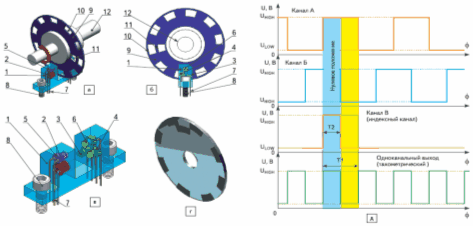 Рис. 18. Инкрементальный энкодер — датчик относительного положения, скорости и направления а–б — угловой инкрементальный энкодер; в — конструкция измерительной головки: 1 — корпус датчика; 2 — светодиод — источник света для инкрементальных каналов А и Б; 3, 4 — ординарные фотодетекторы (фототранзисторы или фотодиоды); 5 — светодиод — источник света для индексного канала; 6 — фотодетектор индексной метки; 7 — терминалы для монтажа на печатной плате; 8 — элементы для монтажа корпуса; 9 — 4-битный (24 = 16 положений) перфорированный ротор с прорезями; 10 — прорези для инкрементальных каналов; 11 — прорезь — индексная метка; 12 — вращающийся вал; г — вариант исполнения 4-битного инкрементального ротора из стекла; д–е — варианты сигналов инкрементального энкодера: д — цифровой инкрементальный энкодер (инкрементальные каналы А и Б, индексный выход В фототранзисторов, канал скорости);