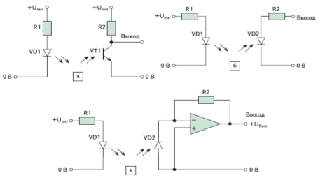 Рис. 17. Типичные принципиальные электрические схемы для включения оптопрерывателя и рефлектора а— схема на основе фототранзистора с цифровым выходом; б— схема на основе фотодиода с аналоговым импульсным выходом; в— схема на основе фотодиода с цифровым импульсным выходом; VD1 — светодиод; VD2 — фотодиод; VT1 — фототранзистор, R1, R2 — токоограничивающие резисторы.