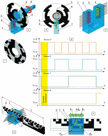 Рис. 19. Абсолютный энкодер — датчик абсолютного положения и скорости а–б — 4-битный угловой абсолютный энкодер; в — конструкция измерительной головки: 1 — корпус датчика; 2 — массив светодиодов; 3 — массив фотодетекторов (фототранзисторов или фотодиодов); 4 — терминалы измерительной головки; 5 — 4-битный ротор с кодом Грэя; 6 — вращающийся вал; г — вариант исполнения 4-битного абсолютного ротора с двоичным кодом из стекла; д — выходной цифровой код двоичного абсолютного энкодера; е, ж — линейный 4-битный абсолютный энкодер с двоичным кодированием и оцениванием посредством V-выборки; 1 — корпус измерительной головки; 2 — измерительная линейка; 3 — массив фотодетекторов V-выборки; е — оценивание посредством V-выборки: AB0, A1…A4, B1…B4 — фотодетекторы в составе двух линеек V-выборки (выбираемые для оценивания подсвечены желтым); ж — иллюстрация линейного абсолютного энкодера.