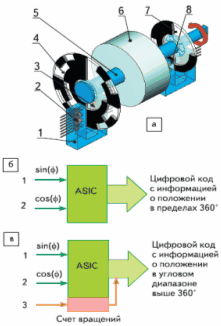 Рис. 20. Многооборотный абсолютный энкодер а — конструкция: 1 — корпус датчика положения в пределах 360°; 2 — массив светодиодов; 3 — массив фотодетекторов; 4 — 4-битный ротор с двоичным кодом; 5 — вращающийся вал; 6 — редуктор; 7 — 2-битный ротор с двоичным кодом; 8 — измерительная головка — счетчик числа оборотов; б–в — сравнение принципов функционирования однооборотного и многооборотного энкодера: б — однооборотный энкодер; в — многооборотный энкодер.