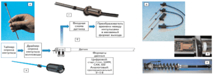 Принцип действия магнитостриктивного датчика линейного положения проиллюстрирован рис. 23г, д.