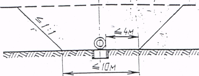 При постройке труб одновременно с отсыпкой земляного полотна или после окончания отсыпки его на данном участке трассы размеры оставляемых в этом случае разрывов в насыпи должны назначаться с учетом способа отсыпки грунта, планирующих и уплотняющих средств. Расстояние между торцовым откосом насыпи и трубой должно быть с каждой стороны не менее 4 м, а общая длина разрыва — не менее 10м.