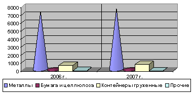 Как видно из таблицы 1, через причалы ОАО "НМТП" перегружались генеральные и навалочные грузы, объемы их переработки составляют соответственно 8525 тыс. т. и 7781 тыс. т. Основная доля навалки грузов приходится на зерновые и достигает 4084 тыс. т. в год, а также здесь перегружается более 1423 тыс. т химических грузов. Среди генеральных грузов наибольшее количество тонн грузопереработки приходится на металлы и контейнеры и составляет соответственно - 7616 тыс. т и 836 тыс. т. Западный район - это единственный район НМТП, причалы которого оборудованы для перевалки контейнеров. Важным показателем работы района является и то, что процент выполнения почти по всем грузам превышает 100%, а это говорит о том, что район усиливает свою мощность и развивает пропускную способность.