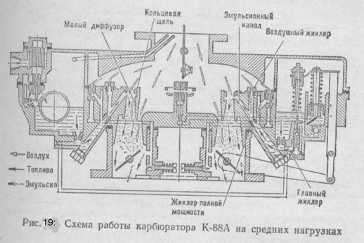 Карбюратор К-88АМ двигателя ЗИЛ-130 имеет две смесительные камеры, каждая из которых обслуживает четыре цилиндра. При работе двигателя на средних нагрузках топливо из поплавковой камеры поступает через главные жиклеры, а затем через жиклеры полной мощности в эмульсионные каналы (рис. 19). В этих каналах к топливу подмешивается воздух, поступающий из воздушных жиклеров и жиклеров системы холостого хода. Образовавшаяся эмульсия попадает в смесительные камеры через кольцевые щели малых диффузоров. Поддержание постоянного состава обедненной смеси происходит за счет торможения топлива воздухом.