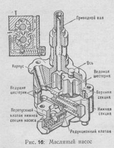 Масляный насос служит для создания необходимого давления в системе смазки. Насос (рис. 16) состоит из корпуса, внутри которого расположены одна или две пары шестерен. Одна из каждой пары шестерен насажена неподвижно на приводном валике, а другая свободно на оси. Приводной валик приводится в действие от косозубой шестерни на распределительном валу. При вращении шестерен насоса их зубья захватывают масло у входного отверстия, проносят у стенок корпуса и выдавливают в выходное отверстие.