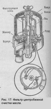 На двигателях ЗиЛ-130 установлен фильтр центробежной очистки с реактивным приводом. Фильтр (рис. 17) состоит из корпуса с осью, где на подшипнике размещен - ротор с колпаком. Снизу ротора размещены два жиклера с отверстиями, направленными в разные стороны, и фильтрующая сетка. Колпак закреплен на оси ротора при помощи гайки и закрыт сверху неподвижным кожухом с барашковой гайкой. Ротор вращается под действием струй масла, выбрасываемого под давлением через два жиклера.