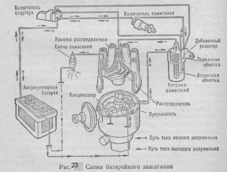 Преобразование тока низкого напряжения в ток высокого напряжения и распределение его по цилиндрам двигателя осуществляется приборами зажигания. Система зажигания состоит из источников тока низкого напряжения, катушки зажигания, прерывателя-распределителя, конденсатора, свечей зажигания, включателя зажигания и проводов низкого и высокого напряжений (рис. 23). В системе зажигания имеется две цепи — низкого и высокого напряжения.