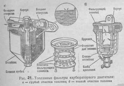 Топливные фильтры и отстойники. Топливо, поступающее к жиклерам карбюратора, не должно иметь механических примесей и воды, так как примеси засоряют отверстия жиклеров, а замерзшая в зимнее время вода явится причиной прекращения подачи топлива. Для очистки топлива в системе питания двигателя предусмотрена установка фильтров и отстойников. Сетчатые фильтры устанавливают в заливных горловинах топливных баков, в корпусе диафрагменного насоса и во входных штуцерах поплавковой камеры карбюратора.