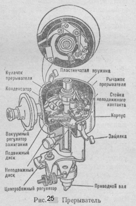 Прерыватель (рис. 25) установлен на двигателе и приводится в действие от распределительного вала. Основными частями прерывателя является корпус, приводной вал, подвижный диск (на котором размещены изолированный рычажок с контактом и неподвижная стойка с контактом), неподвижный диск, центробежный и вакуумный регуляторы опережения, октан-корректор и кулачок с выступами по числу цилиндров. Кулачок соединен с приводным валиком через центробежный регулятор. Контакты прерывателя наплавлены тугоплавким металлом вольфрамом. Рычажок прерывателя закреплен на диске шарнирно и своим контактом прижимается к неподвижному контакту пружиной. Вращающийся приводной валик кулачками нажимает на текстолитовый выступ рычажка прерывателя и за один оборот разомкнет, а пружина сомкнет контакты столько раз, сколько имеется выступов на кулачке.
