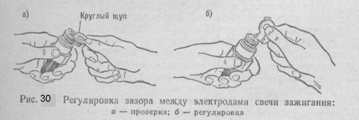 На двигателях автомобилей ЗиЛ-130 устанавливают свечи АИ, где буква А обозначает, что диаметр резьбы 14 мм, цифра 11 указывает калильное число, длина вверткой части корпуса — 12 мм. Большое влияние на работу свечи зажигания оказывает зазор между центральным и боковым электродами. Заводы рекомендуют зазоры 0,85 ... 1,00 мм. Уменьшение зазора против нормы вызывает обильное нагарообразование на электродах свечи зажигания и перебои в ее работе. При большем зазоре из-за повышения сопротивления ухудшаются условия искрообразования, отчего также будут возникать перебои в работе двигателя. Регулируют зазор подгибанием бокового электрода, а его размер проверяют круглым щупом (рис 30). Центральный электрод подгибать нельзя так как разрушается керамическая изоляция и свеча зажигания отказывает в работе.