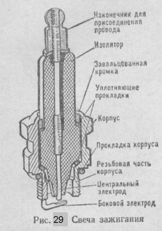 Свечи зажигания. Электрический разряд — искра — образуется в цилиндре между электродами свечи зажигания. Свеча (рис. 29) состоит из центрального электрода с изолятором (сердечник свечи) и стального корпуса, в котором он крепится. Корпус имеет нарезную ввернутую часть, которой свеча ввернута в нарезное отверстие головки цилиндров двигателя, в нижней части корпуса имеется один боковой электрод. В верхней части корпус свечи зажигания имеет грани под ключ. Центральный электрод с изолятором завальцован в корпусе свечи. Для уплотнения между кромками корпуса и буртиком изолятора проложены уплотняющие прокладки. На центральном электроде сверху установлен наконечник для крепления провода высокого напряжения