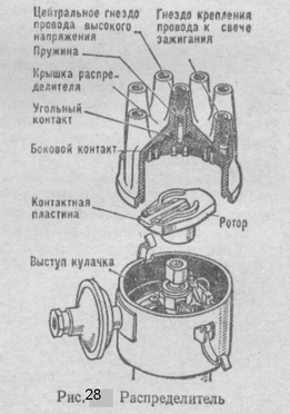 Распределитель установлен сверху на корпусе прерывателя и состоит из ротора и крышки (рис. 28). Ротор изготовлен в виде грибка из карболита, сверху в него вмонтирована контактная пластина. Крепится ротор на выступе кулачка. Крышка распределителя изготовлена также из карболита. На наружной ее части по окружности выполнены гнезда по числу цилиндров, в которые вставляются провода, присоединяемые к свечам зажигания. В крышке размещено центральное гнездо для крепления провода высокого напряжения от катушки зажигания. Внутри, против каждого гнезда, расположены боковые контакты, а в центре — угольный контакт с пружиной для соединения центрального гнезда с пластиной ротора.