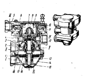 II - вывод к крану управления стояночной тормозной системой; III - вывод к секции тормозного крана; IV - вывод в тормозную магистраль прицепа; V - вывод к ресиверу; VI - вывод атмосферный