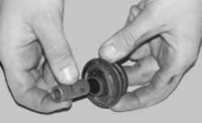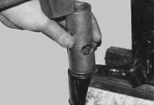 12. Встановлюємо амортизатор вертикально і кілька разів до упору опускаємо і піднімаємо шток амортизатора. Переконаємося в тому, що шток переміщується без провалів, заїдань і стукотів. В іншому випадку замінюємо амортизатор. Крім того, замінюємо амортизатор при виявленні патьоків рідини (допускається незначне запотівання у верхній частині корпусу) і при пошкодженні різьблення у верхній частині штока.