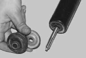 10. Знімаємо з штока амортизатора нижню гумову подушку в зборі з розпорною втулкою і шайбу.