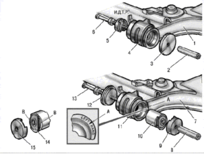 1 - важіль; 2, 8 - гайка; 3, 12 - шайба; 4, 11 - пристосування; 5, 9, 15 - монтажна втулка; 6, 13 - болт; 7 - важіль задньої підвіски; 10, 14 - сайлентблок; А - мітка на пристосуванні; В - вирізи на сайлентблоку.