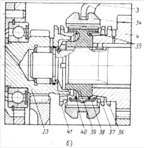 Муфта 34 (мал., би) синхронізатори може переміщатися по зубчастій маточині 39, закріпленою на веденому валу. У трьох пазах маточини розташовані сухарі 38, що входять виступами в кільцеву проточку зубів муфти під дією двох кільцевих пружин 40. По сторонах муфти встановлені бронзові блокуючі кільця 37 і 41, що мають зовнішні зубчасті вінці і внутрішню конічну поверхню з таким же кутом конусності, як в конічних поверхонь 35 відповідно провідного валу 23 і колеса 4 третіх передачі. У пази на торцях блокуючих кілець з окружним зазором, рівним половині товщини зуба зубчастих вінців, входять кінці сухарів 38.