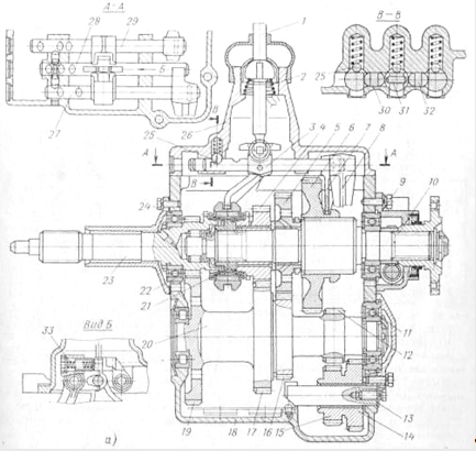 Механізм перемикання коробки передач складається з вилок 3, 7, 8 (див. мал., а), закріплених на повзунах 27-29, важеля / перемикання, що притискується пружиною 2 до сферичної поверхні кришки 26, кулькових фіксаторів 25, що запобігають мимовільному включенню і виключенню передач, замку, що виключає одночасне включення двох передач, і пружинного запобіжника, що утрудняє включення передачі заднього ходу. Замок складається з двох сухарів 30 і 32, розміщених в горизонтальному отворі кришки між середнім і крайнім повзунами, і штифта 31, середнього повзуна, що знаходиться в отворі. При переміщенні середнього повзуна обоє сухаря виходять з його поглиблень і замикають крайні повзуни, виключаючи їх зсув. При переміщенні одного з крайніх повзунів сухар виходить з його поглиблення, замикає середній повзун і, сухар, замикає також і інший крайній повзун.