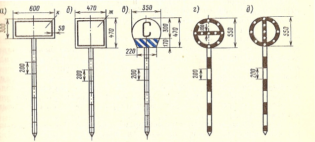 в)- сигнальный знак о подаче свистка «С»; г)- сигнальный знак «Начало опасного места»; д)- сигнальный знак «Конец опасного места»;