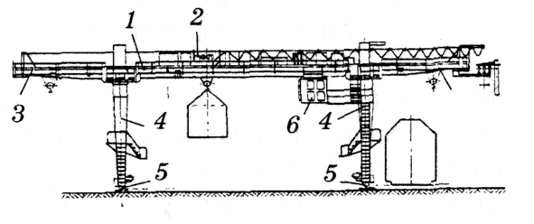 1- мост; 2 грузоподъемная тележка; 3 консоли ;4 стоечные опоры; _5 ходовые тележки;6 кабина.