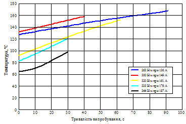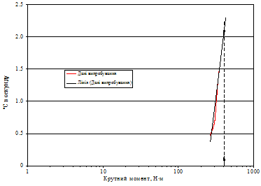 Рисунок 4.19 показує залежність швидкості зміни температури від крутного моменту. Спроектована точка – це точка із координатами 400 Н∙м і 2,1 0С/с. Якщо температура електродвигуна 40 0С , то для досягнення критичної температури необхідно 62 с((170-40)/2,1). Якщо обмотка електродвигуна гаряча і її температура 160 0С, то для виконання тієї ж операції необхідно 4,8 с при максимальному навантаженні ((170-160)/2,1).