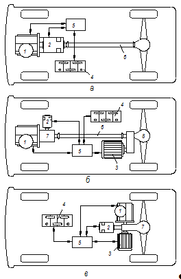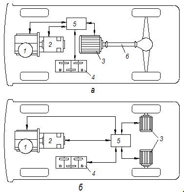 У паралельній схемі як електропривід може використовуватися мотор-генератор, з'єднаний з колінчатим валом ДВЗ, що дозволяє вимикати ДВЗ при нетривалій зупинці АТЗ і наступному пуску ДВЗ по команді водія почати рух (рисунок 1.2, а).