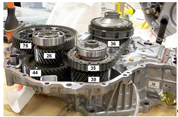 Основні складові ланки в Пріус – це механізм автоматичного розподілу потужності, генератор, електродвигун, інвертор і понижувальні шестерні. Мета механізму розподілу потужності полягає в тому, щоб дозволити передавати потужність від двигуна на генератор і колеса одночасно. Тут потужність передається через планетарну передачу. Водило планетарного механізму з’єднане з валом ДВЗ і потужність від ДВЗ передається на внутрішню сонячну і зовнішню коронну шестерню. Коронна шестерня безпосередньо зв’язана з електродвигуном і передає силу тяги на колеса, сонячна шестерня з’єднана з валом генератора. На рисунках 2.4 і 2.5 зображено схему механізму розподілу потужності окремо і разом з блоком шестерень відповідно. Фотографія фактичного розміщення передачі зображена на рисунку 2.6.